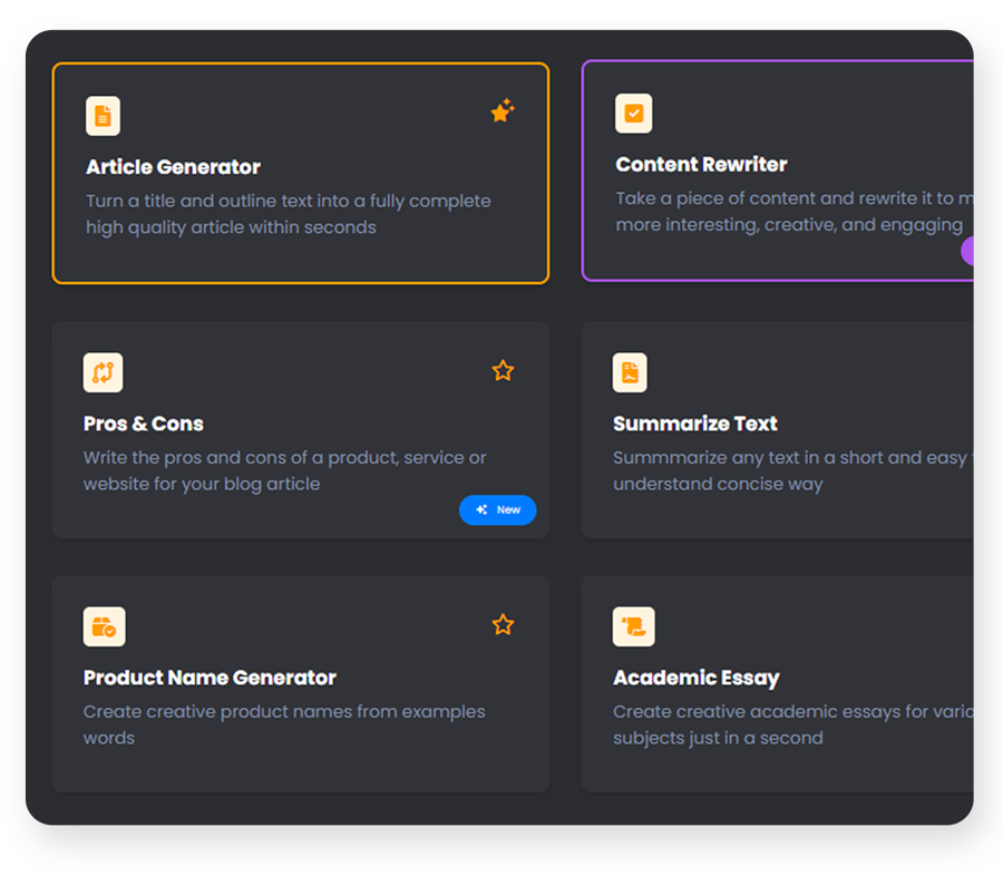 - Dive into a library of AI writers: Craft social media captions, website hero sections, blog posts, essays, and more – all with the help of specialized AI tools.